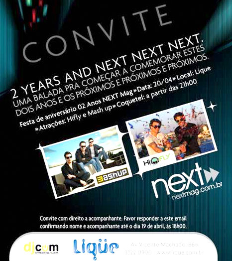 Nesta quarta-feira, antecipando o feriado, a NEXT Mag - revista 100% eletrônica - recebe uma galera animada com coquetel das 21h às 23h30 na Liqüe, para comemorar os 2 anos da revista..